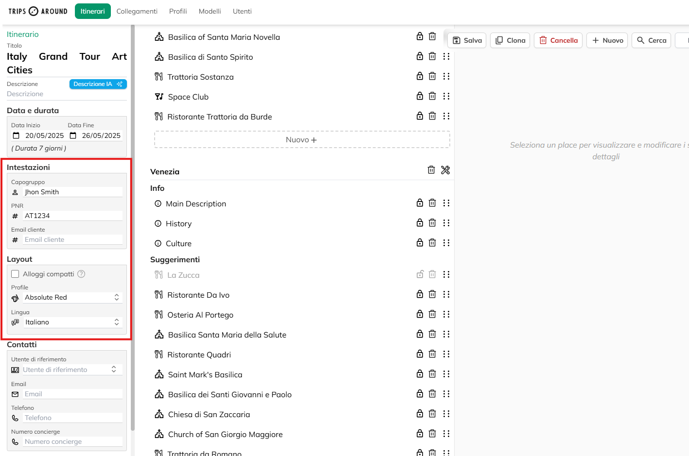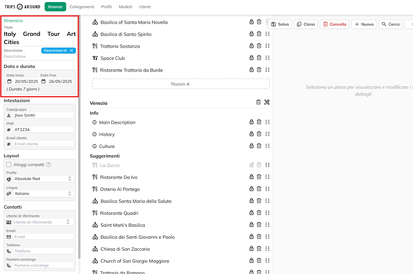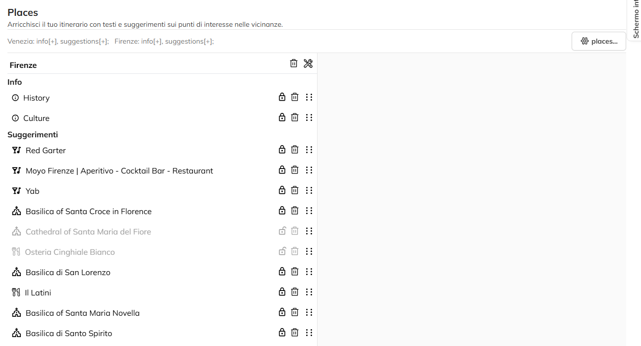 Per le tipologie di attività di tipo “Info” o “Suggerimento” dovrete aver aggiunto in precedenza dei “Places” nella relativa sezione, in caso di nuovo itinerario quest’ultima comparirà dopo il salvataggio. I Places arricchiscono il vostro itinerario con testi e suggerimenti sui punti di interesse nelle vicinanze. Potrete aggiungere manualmente delle informazioni riguardo alle attrazioni dell’itinerario o utilizzare l’IA per generarne in automatico.