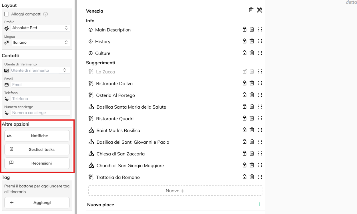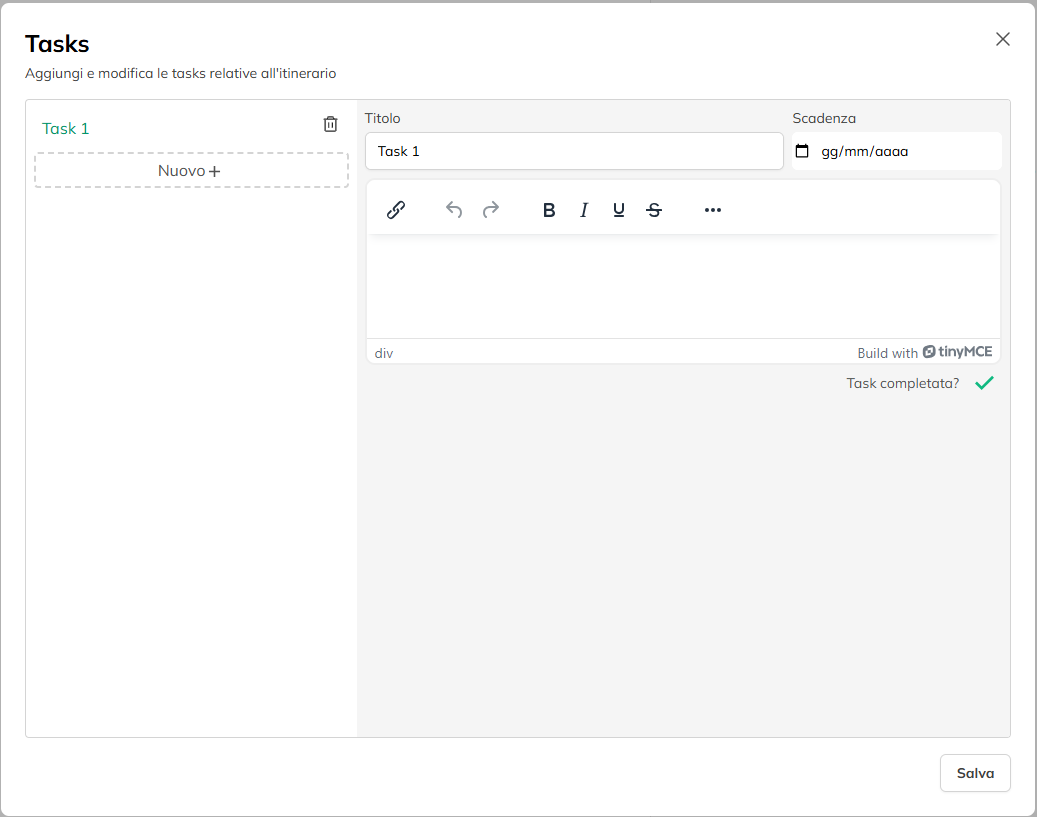 Cliccate su “Nuovo” per aggiungerne uno oppure selezionatene uno esistente per contrassegnarlo come chiuso o viceversa. La lista dei task aperti comparirà anche nella homepage, cliccando sul quale si aprirà la schermata di modifica dell’itinerario associato.