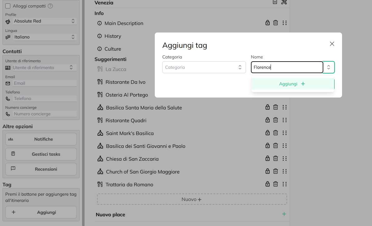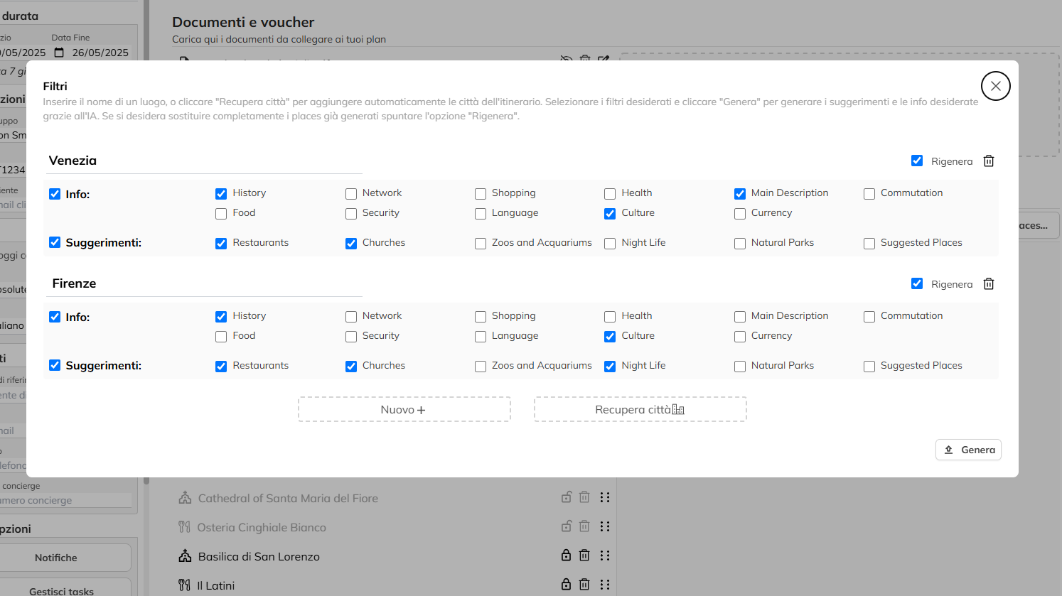 Per farlo cliccate sul relativo pulsante e inserite il nome di un luogo, o cliccare “Recupera città” per aggiungere automaticamente le città dell’itinerario. Per ogni città selezionare i filtri desiderati e cliccare “Genera” per generare i suggerimenti e le info desiderate grazie all’IA. Se si desidera sostituire completamente i places già generati spuntare l’opzione “Rigenera” o su “Elimina” per cancellarne una.