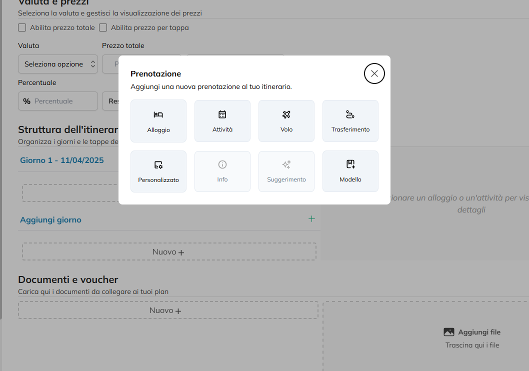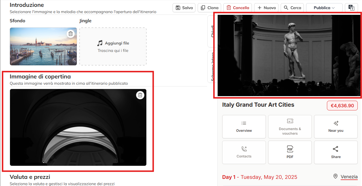 Nella sezione Valuta e prezzi potrete gestire la la valuta e la visualizzazione dei prezzi dentro l’itinerario.