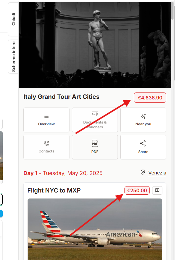Avrete la possibilità di inserire il prezzo totale dell’itinerario oppure potrete inserirlo per ogni tappa dell’itinerario e calcolare il prezzo finale cliccando su “Calcola prezzo totale”.