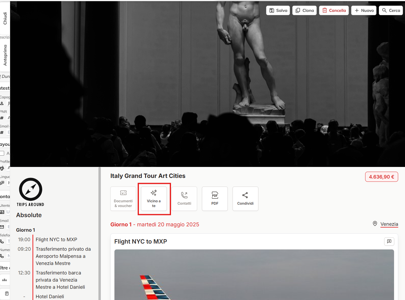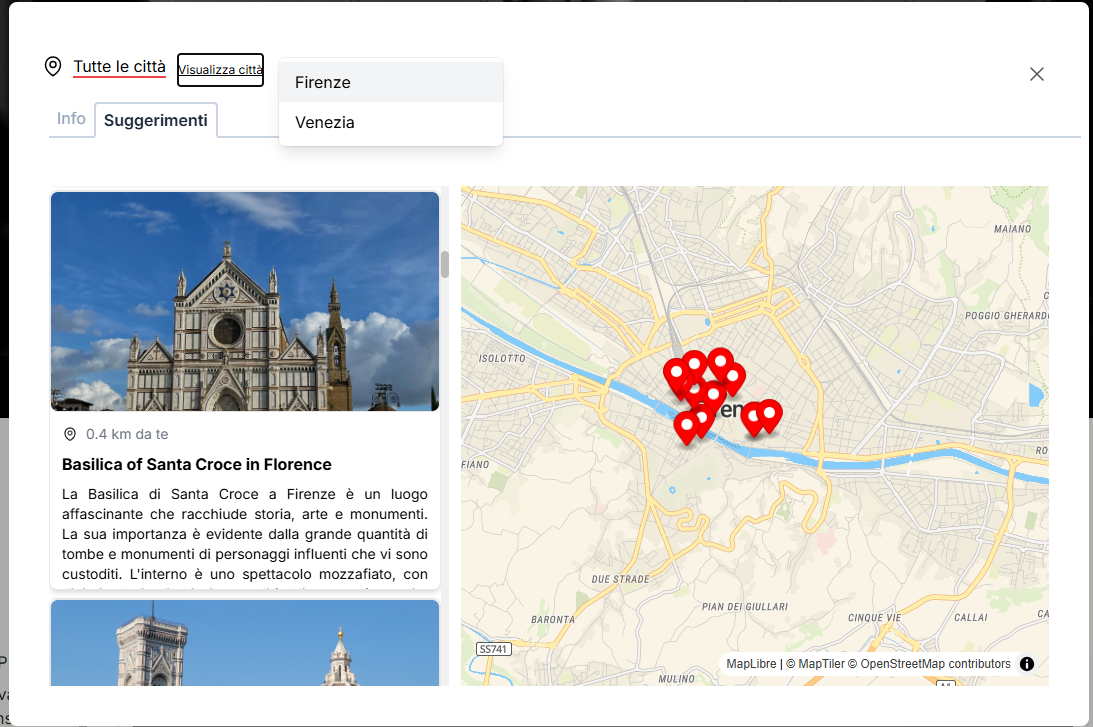 I suggerimenti e le info aggiuntive inseritie tramite questa maschera compariranno nella relativa sezione dell’itinerario cliccando su “Vicino a te” filtrabili per città.