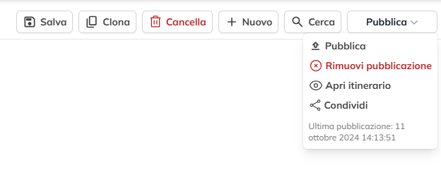 In caso di nuovo itinerario una volta salvate le modifiche potrete procedere alla pubblicazione cliccando sul pulsante “Pubblica” in alto a destra. Il sistema genererà quindi un link tramite il quale l’itinerario sarà visibile.
