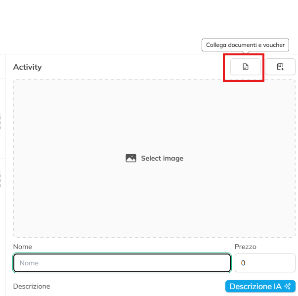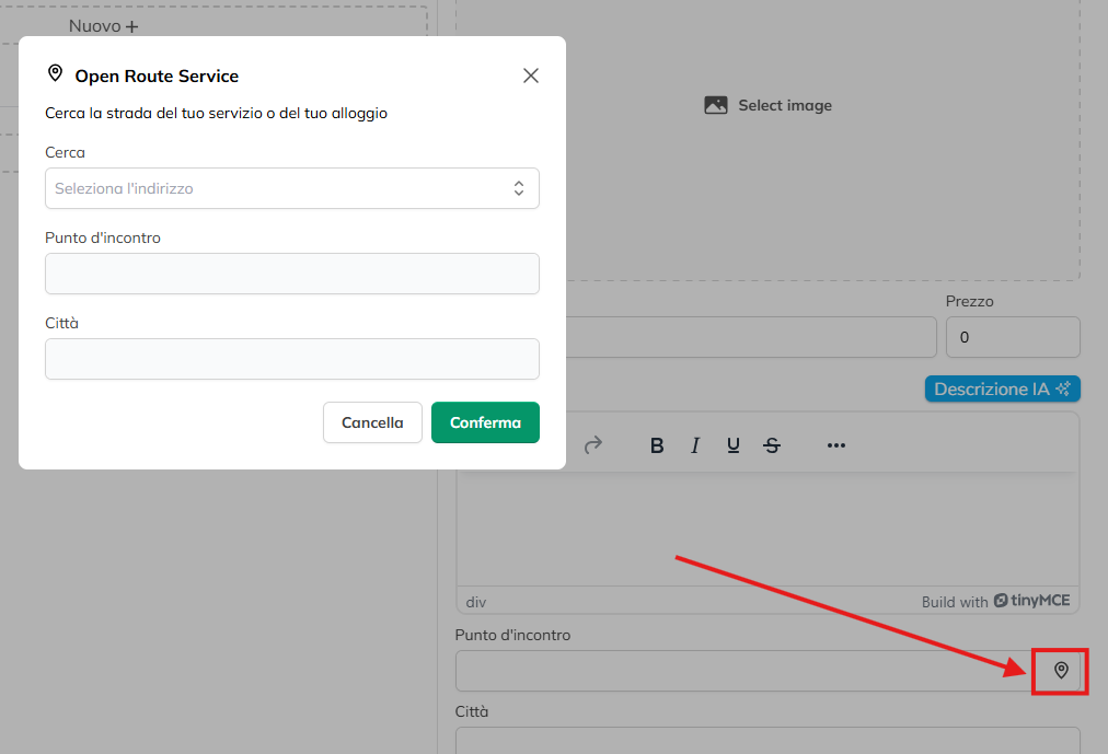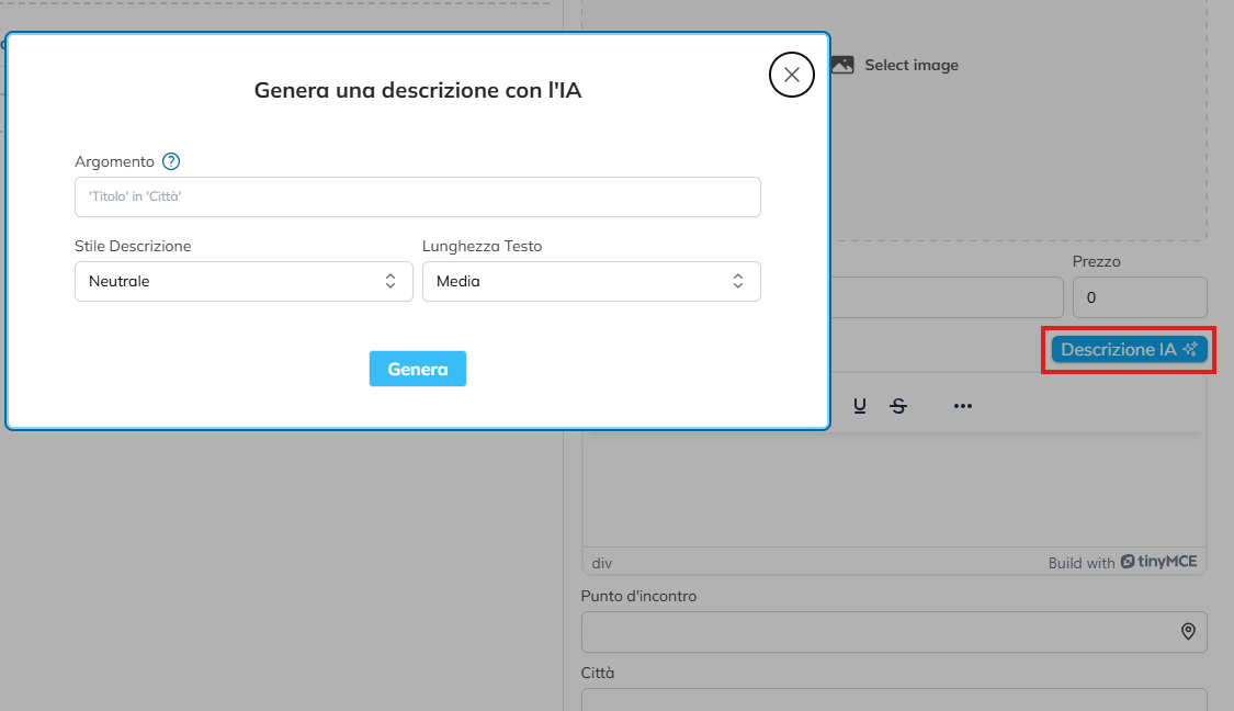Per le tipologie di attività che lo supportano avrete a disposizione la generazione di una descrizione tramite IA. Per farlo cliccate sul pulsante “Descrizione IA”. Si aprirà quindi il popup di generazione, scrivete del testo che spieghi all’IA di cosa tratta la descrizione. Se non viene fornito alcun testo, la descrizione verrà generata basandosi sia sul titolo del piano che sulla città correlata, scegliete il tono e la lunghezza e cliccate su “Genera”, al termine dell’elaborazione il campo verrà compilato in automatico.