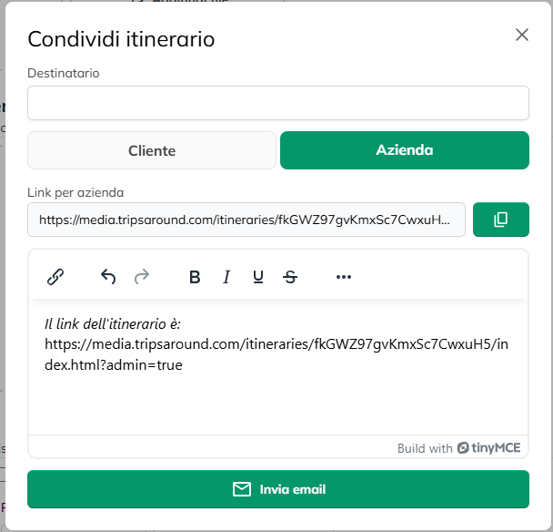 Tra queste troverete la funzione di condivisione tramite la quale potrete condividere il link con il diretto interessato inserendo l’indirizzo mail del cliente. Potrete personalizzare il messaggio tramite l’editor di testo della stessa modale e inviarlo cliccando su “Invia email”.
