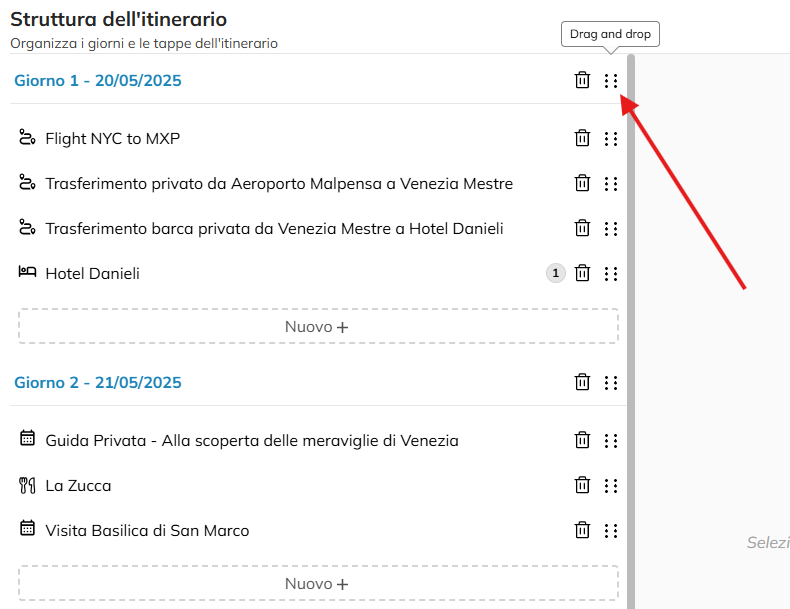 L’editor di struttura dell’itinerario supporta anche il Drag and drop di attività e giorni grazie al quale potrete spostarli a piacimento nell’interfaccia.
