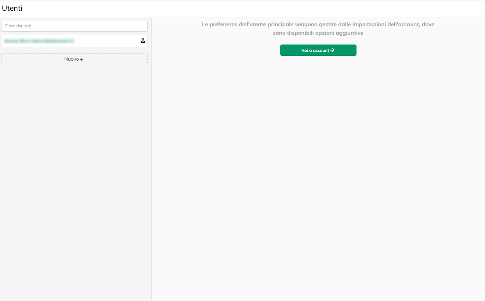 Nella parte sinistra della schermata comparirà l’elenco degli utenti esistenti (se presenti) e il pulsante Nuovo + per crearne di nuovi. N.B per creare più utenti è necessario aver sottoscritto un piano “Premium”. Potete utilizzare il campo Filtra risultati per cercare rapidamente un utente specifico per nome, cognome o email. Facendo clic su un utente già presente, potrete visualizzarne e modificarne i dettagli nella sezione di destra, denominata Dettaglio Utente. Se l’utente è l’utente principale dell’account, nella schermata comparirà un pulsante Vai a account che rimanda alle impostazioni avanzate, poiché le sue preferenze vengono gestite direttamente da lì.