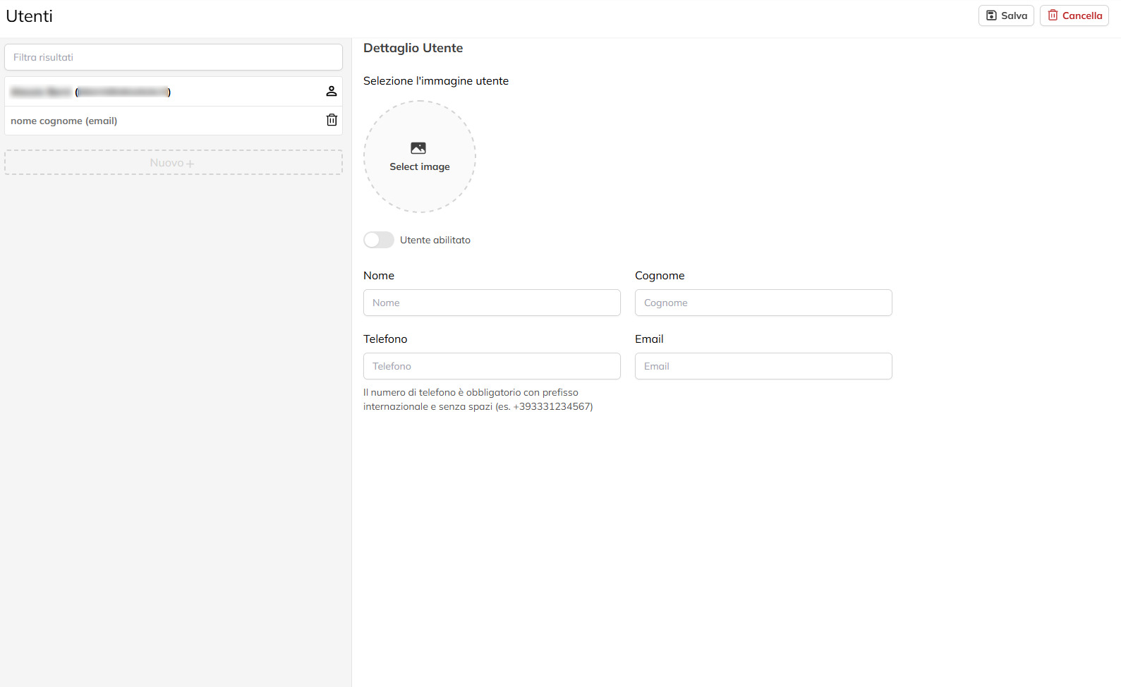 Fate clic su Nuovo + nella parte sinistra dello schermo. Nella sezione Dettaglio Utente a destra, compilate i campi richiesti: Nome e Cognome, Telefono, Email, (Facoltativo) Caricate una foto profilo facendo clic su Select image. Utilizzate l’interruttore Utente abilitato per abilitare o disabilitare immediatamente l’accesso di questo utente. Al termine, premete Salva per confermare la creazione del nuovo utente. Al primo login, verrà automaticamente inviata al nuovo utente un’email con una password temporanea per il primo accesso, l’utente dovrà obbligatoriamente impostare una nuova password personale dopo il login.